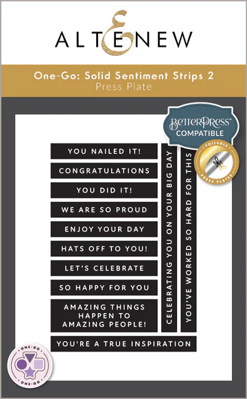 The One-Go: Solid Sentiment Strips Die coordinates with all three included press plates and helps cut all the sentiments in one quick step.